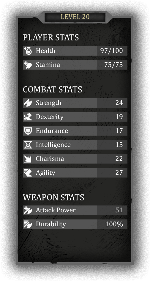 Strength, Dexterity, Endurance, Agility, Intelligence, and Charisma.